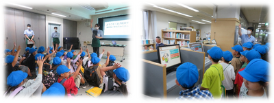 図書館での子供たちの様子は、職員さんの図書館の紹介や利用の仕方の説明に目や耳を傾けたり、図書館内を見学し、図書館内のフロアや書庫、返却ボックスの裏側などを見学したりと、とても充実していたようです。
