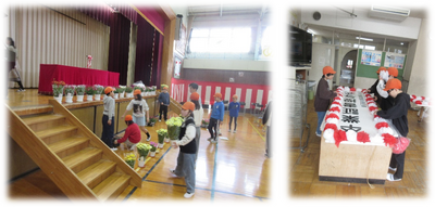 本日、3時間目に4・5年生による卒業式前日準備を行いました。子供たちは、体育館や廊下、階段、昇降口の清掃をはじめ、看板の飾り付けやステージ付近の生花の設置、椅子の整列など、卒業式に向けて心を込めて準備に取り組みました。