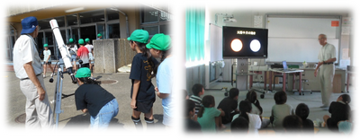 日差しの強い暑い中ではありましたが、2時間目でも薄く月が現れていました。子供たちが望遠鏡を前に列で並び、一人一人覗き込むと明るすぎるようで、「どこ?どこ?」と月を探している様子が見られましたが、見つけることができると、「三日月っぽい形をしていた!」と教えてくれる子もいました。その後、3時間目には PC 室で月の明るさや動き方など、具体物を用いて子供たちに分かりやすく教えていただきました。「月が、動いている!」と、今日の学びを確認しようとしている子の言葉を聞いて、私たち教員もうれしい気持ちになりました。