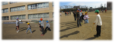 今日の業間休みは、スマイリー班(縦割り班)で長縄の「8の字跳び」を行いました。このスマイリー班での長縄は先々週の木曜日の業間休みからやっているため、今回は3回目の実施となります。江藤先生から「何度でも失敗していいよ。」と言う声かけがあり、それを聞いた子供たちは失敗を恐れず、何度でも挑戦していました。また、上級生の子供たちが回し手となり、長縄をゆっくり回すことで安心して跳びやすくしてあげたり、跳んでいる瞬間に速く回してあげたりと工夫をして、低学年の子供たちが跳ぶことに自信が持てるように努めていました。リズミカルに跳べるようになってくると、「はい!はい!・・・・」と、更に跳びやすくなる「かけ声」が自然と生まれていました。そして、続けて跳べるようになり、みんなで喜んでいる子供たちの姿は、とても印象的でした。